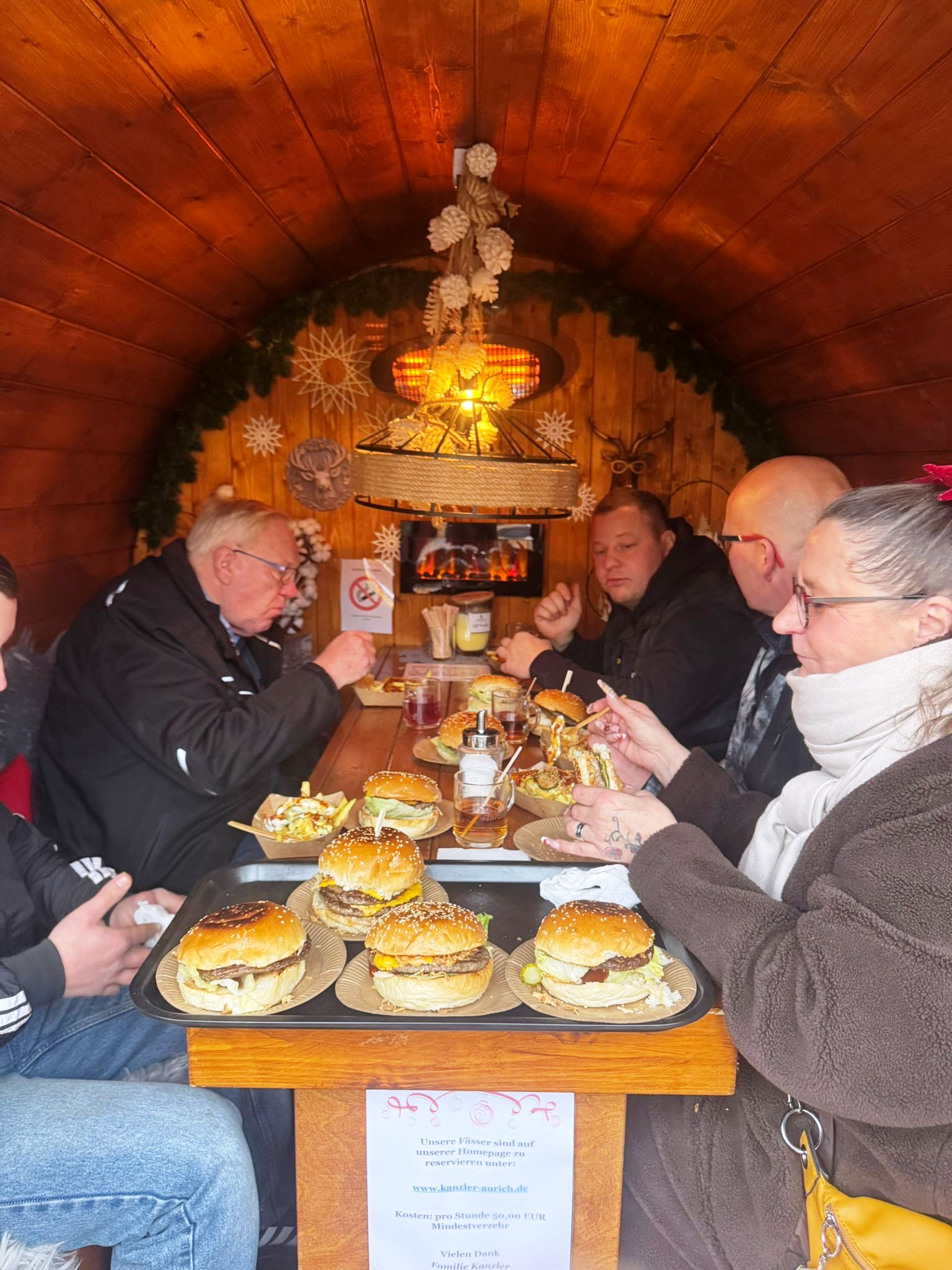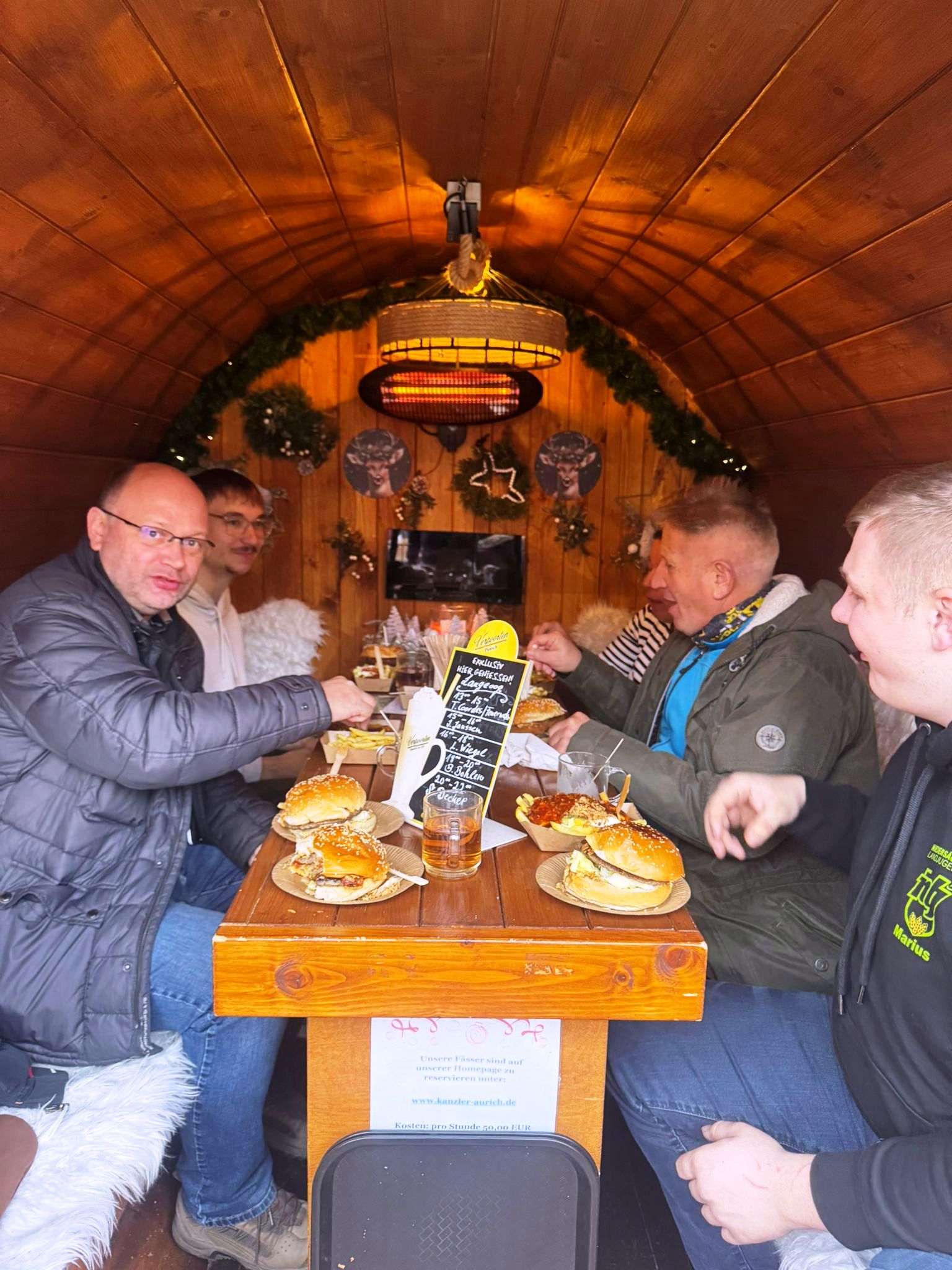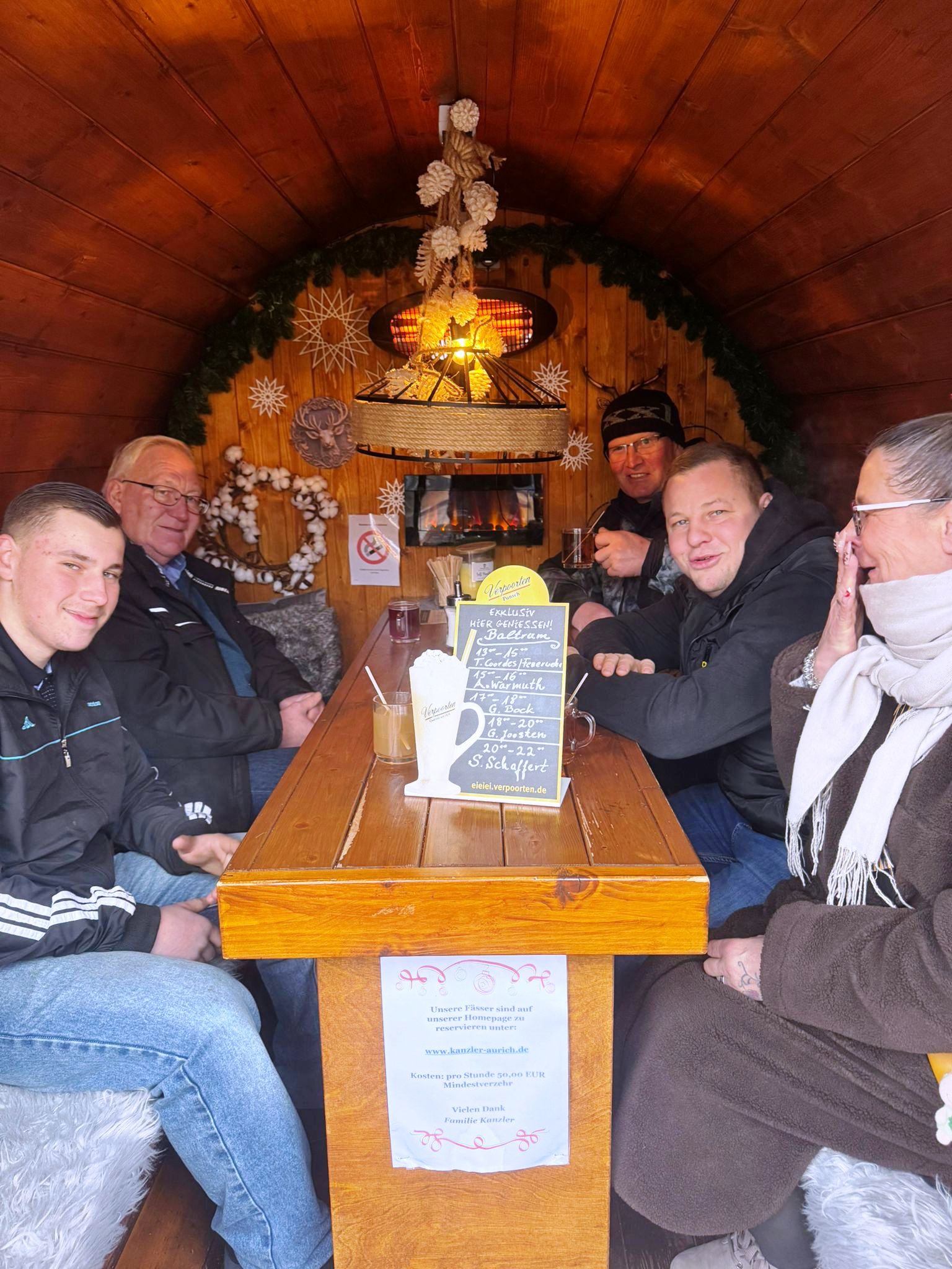 Am 20.12.2025 ging es für die Mitglieder der Ortswehr Wiarden wieder zu einer Überraschungsweihnachtsfeier, keiner aus der Ortswehr wusste Bescheid – außer unserem Organisator Titzian. Es ging mit dem Bus nach Aurich zum Weihnachtsmarkt. In für uns reservierten Fässern konnte man sich es gut gehen lassen: Glühwein, Grog und Essen schmeckten. Anschließend durfte natürlich der Bummel über den Weihnachtsmarkt nicht fehlen. Dann ging es mit dem Bus wieder zurück in das Wangerland nach Wiarden. Im Feuerwehrgerätehaus bei gemütlicher Musik, Kerzenschein und Getränken klang die Weihnachtsfeier dann aus. Dank an unseren Ortsbrandmeister Titzian für diesen schönen Tag.